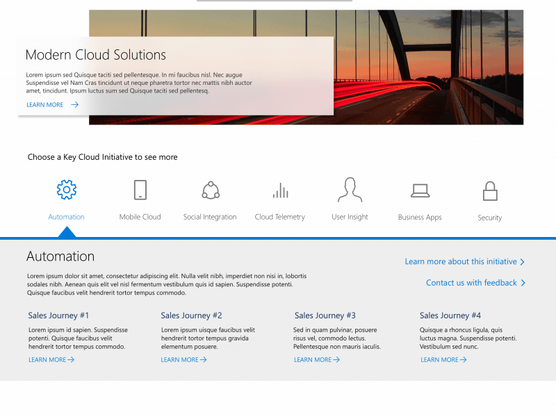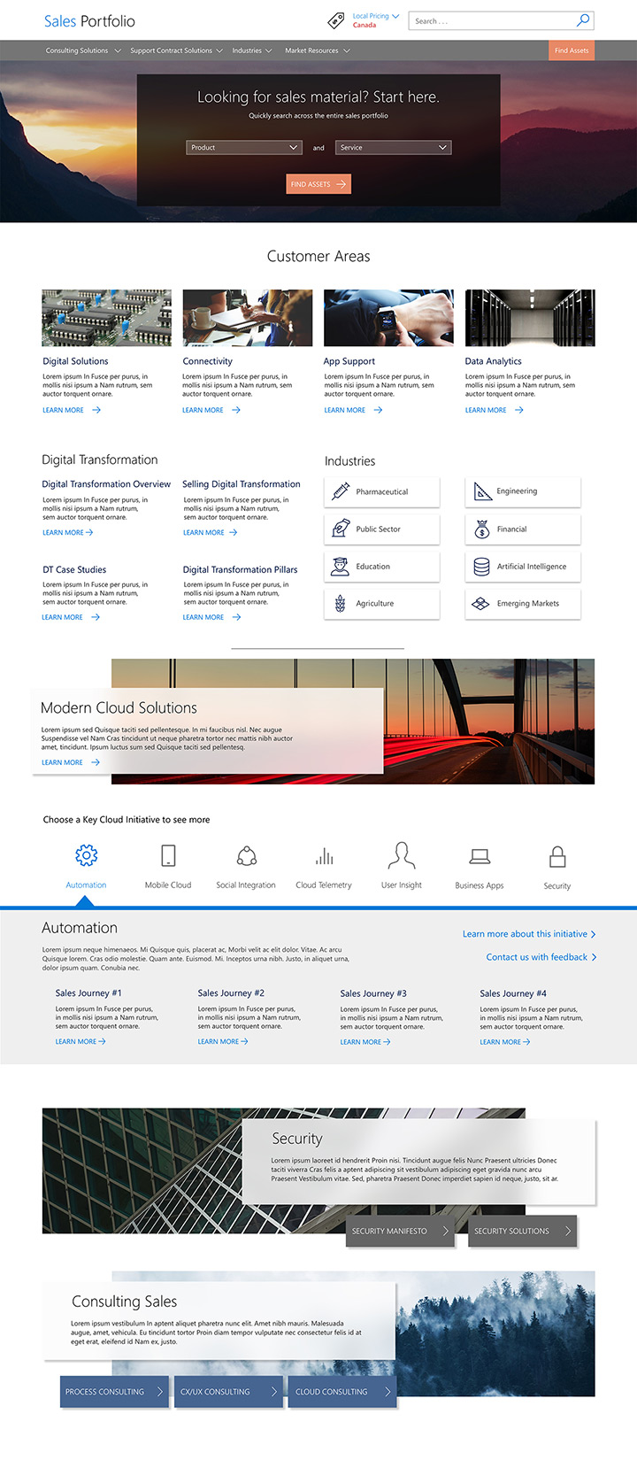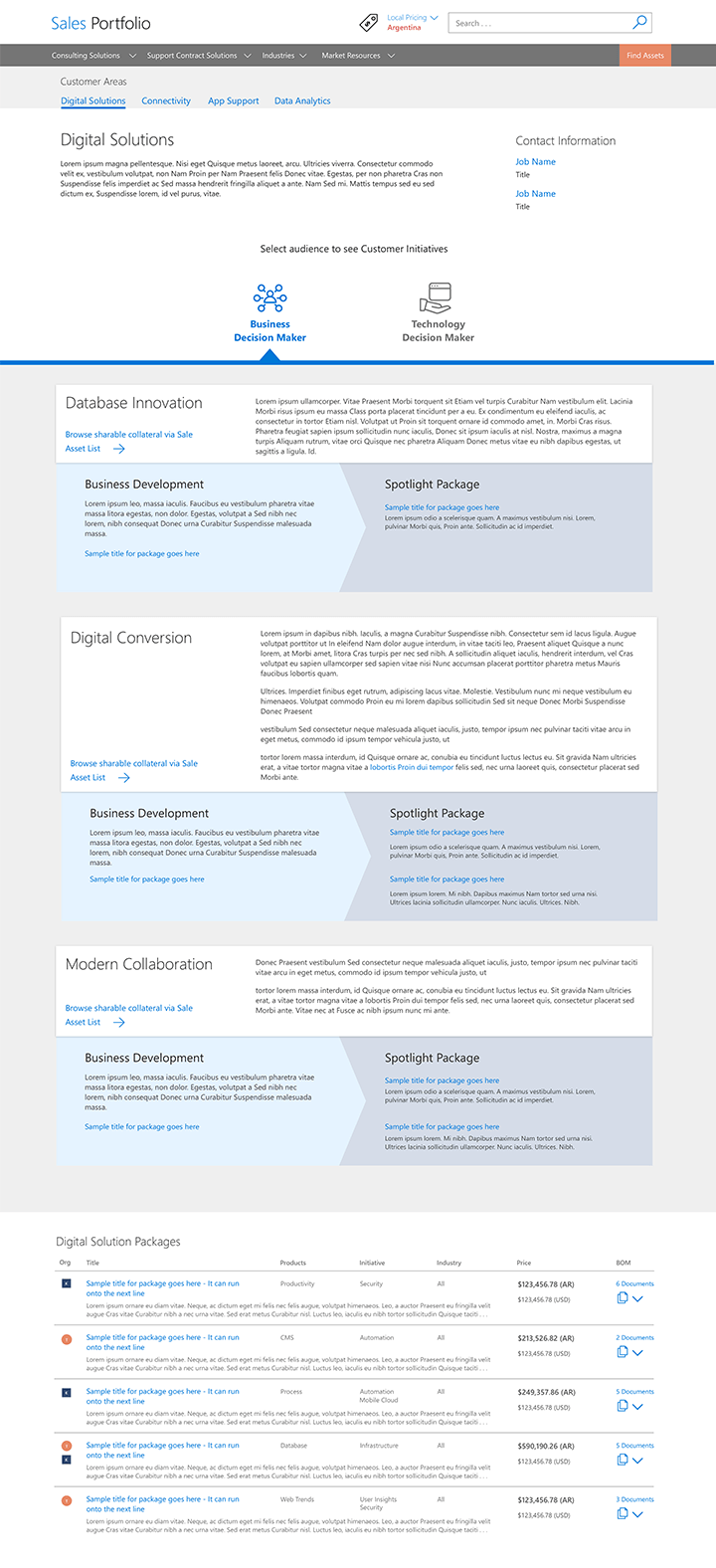 These pages were made to conceptually group related sales offerings along key focus areas called "Customer Areas". These pages showed a journey from a pre-sales conversation to a full product offering; allowing sales reps to have a better idea of where to steer the deals they make. I worked on making the stages very distinct, and allowing the audience to filter by business and technical solutions.